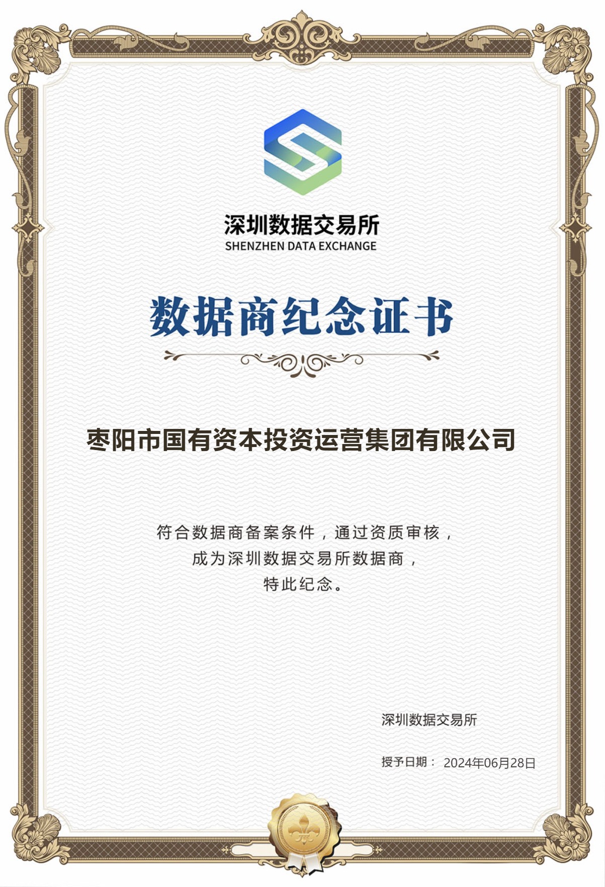 近日,集团荣膺深圳数据交易所颁发的“数据商纪念证书”,成为襄阳市首批在深圳数据交易所完成认证的数据商。